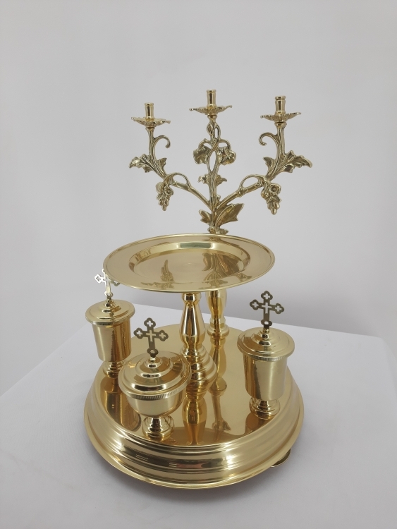 Літейне блюдо, висота з підсвічниками 43 сантиметри, діаметер 31см. Висота підставки 7 см, висота посудин з ковпаками: 31см. Діаметер миски 21см