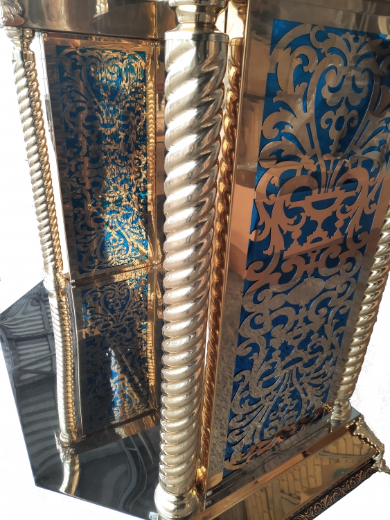 Кіот 90х90см (висота 300см) Кіот зроблений з якісної деревяної основи, та обшитий булатом, на булаті виконана лазерна різка за допомогою якої набувають незвичних візерунків, також використовується кольоровий булат для контрасту.