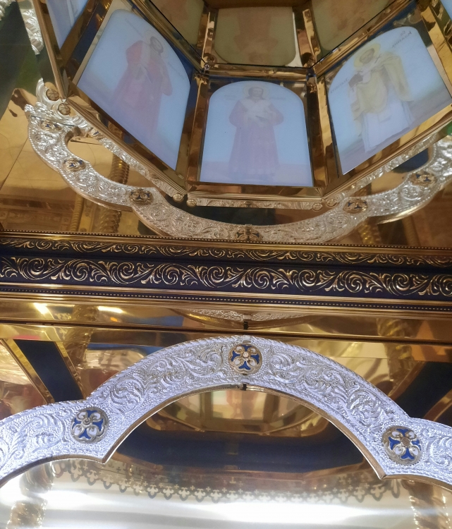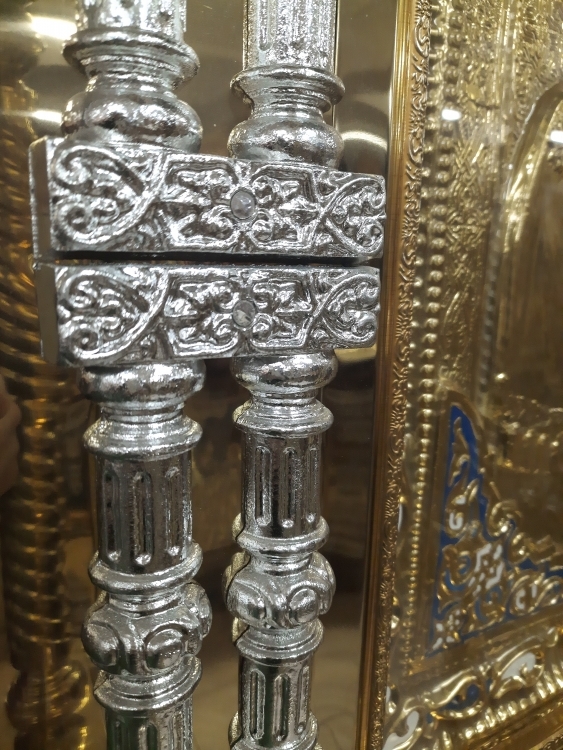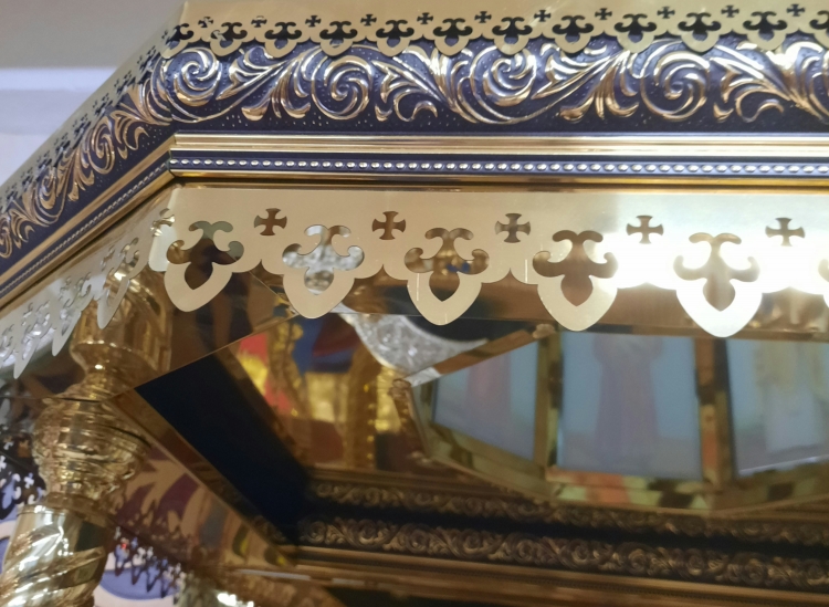 Кіот 90х90см (висота 300см) Кіот зроблений з якісної деревяної основи, та обшитий булатом. На булаті виконана лазерна різка, за допомогою якої набувають незвичних візерунків, також використовується кольоровий булат для підкреслення орнаментів. Зверху кіота присутній купол в якому розташовані 8 ікон