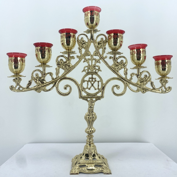 Семисвічник напрестольний Матеріал: латунь Висота: 52 см Ширина: 54 см Лампадки в комплект не входять