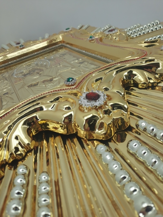 Спускна ікона власного виробництва. Оздоблення образу: позолота, сріблення, карбування, стрази та стразові ланцюги. Розмір: 55х65см Ця ікона має багатий та урочистий дизайн, виконаний у стилі, характерному для православних храмів. Центральна частина займає зображення Богородиці з Ісусом на руках, оточене майстерно вигравійованими орнаментами. В іконі домінує золоте покриття, що символізує святість і небесну славу. Рамка має вигляд сонячного сяйва, яке підкреслює сакральність образу. Вона...