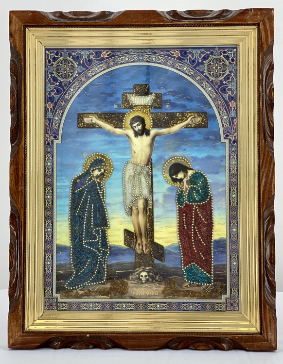 Икона Голгофа имеет прямоугольную рамку, на которой выполняются узоры с помощью обжига. Этот процесс подразумевает применение высокой температуры для создания рисунков на поверхности рамки. Подрамник иконы изготовлен из пластика, на который нанесено напыление золотистой краски. Литография на иконе выполнена краской, также украшена бисером и камешками. Размер: 55х75