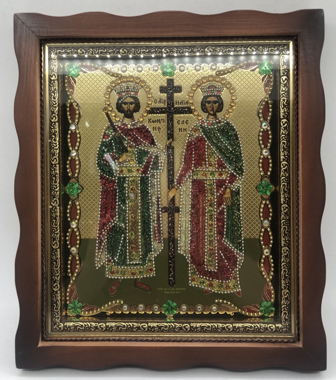 Икона равноап. У Константина и Елены фигурная рамка в виде волны. Подрамник сделан из пластика и покрыт золотистой краской. Литография украшена декоративными камешками и бисером, покрывающимся лаком. Размер: 30х26