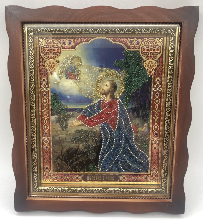 Икона Молитва о Чаше имеет фигурную рамку в виде волны. Подрамник сделан из пластика и покрыт золотистой краской. Литография украшена декоративными камешками и бисером, покрывающимся лаком. Размер: 30х26