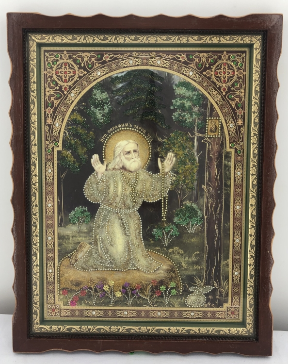 Икона прп. Серафим Саровский имеет фигурную рамку в виде волны. Подрамник иконы изготовлен из пластика, на который нанесено напыление золотистой краски. Литография на иконе выполнена краской, также украшена бисером и камешками. Эти элементы украшают икону и создают изысканный эффект. Размер: 46х36