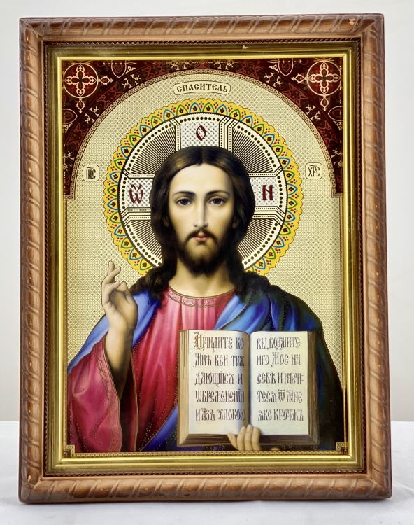 Икона Спасителя на деревянной основе имеет фигурную форму в виде косички, подрамник из пластика с напылением золотистой краски, литография имеет тиснение на бумаге. Размер 32х42