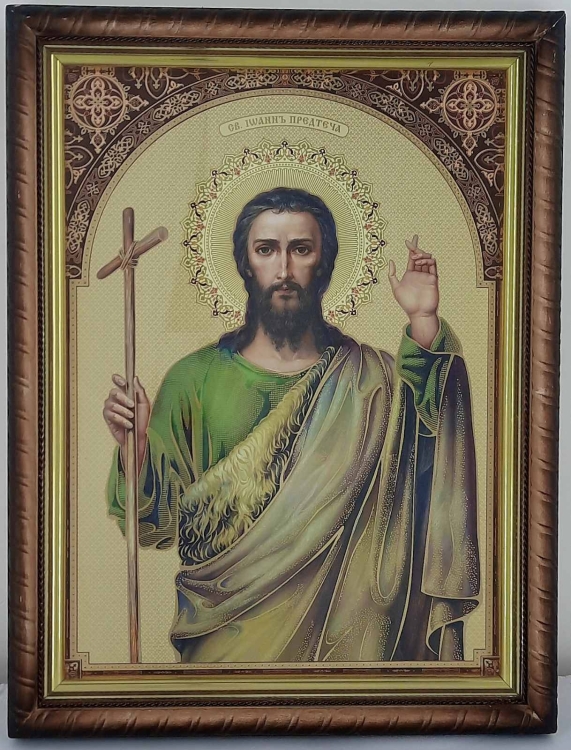 Эта икона выполнена на деревянной основе имеет фигурную форму в виде косички, подрамник из пластика с напылением золотистой краски, литография имеет тиснение на бумаге. Размер 32х42