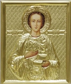 Икона вмч. Пантелеимона изготовлена ​​на деревянной основе с тонким объемным слоем металла, вылитым литьем, покрываемым имитацией искусственного золота. Размер 11х13