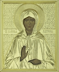 Икона блаж. Матрона изготовлена ​​на деревянной основе с тонким объемным слоем металла, вылитым литьем, покрываемым имитацией искусственного золота. Размер 9х11