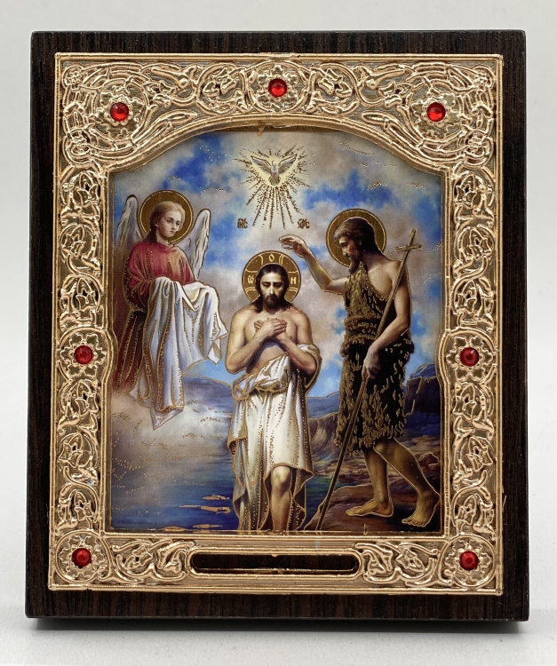 Икона Крещения Господня рамка изготовлена ​​из деревянного основания. Оклад иконы выполнен из пластика с орнаментом, также оклад украшен красными камешками. Печать литографии на бумаге позволяет передать детали изображения с большой точностью и яркостью. Размер:11х13 см
