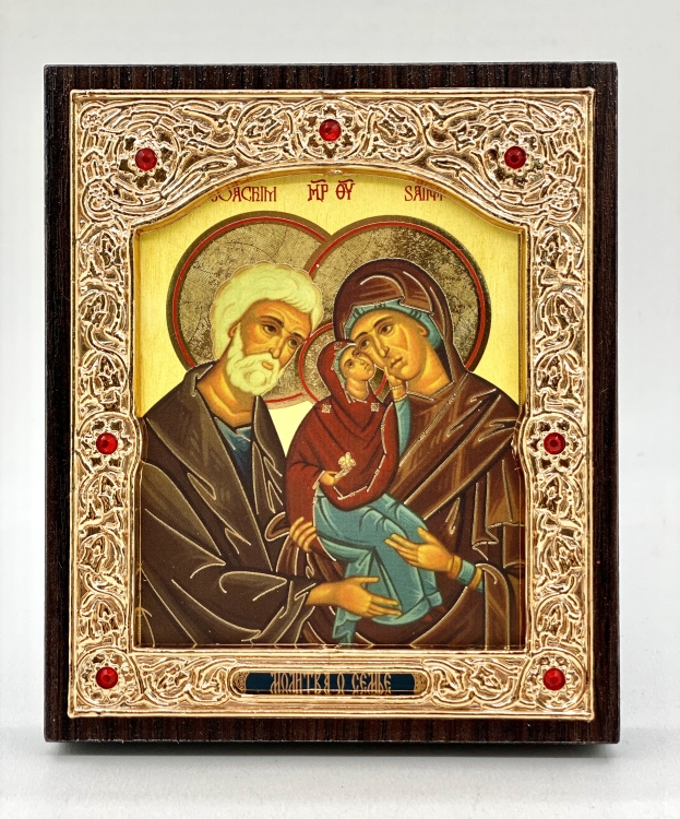 Икона Святого семейства рама изготовлена из деревянного основания. Оклад иконы выполнен из пластика с орнаментом, также оклад украшен красными камешками. Печать литографии на бумаге позволяет передать детали изображения с большой точностью и яркостью. Размер:11х13 см