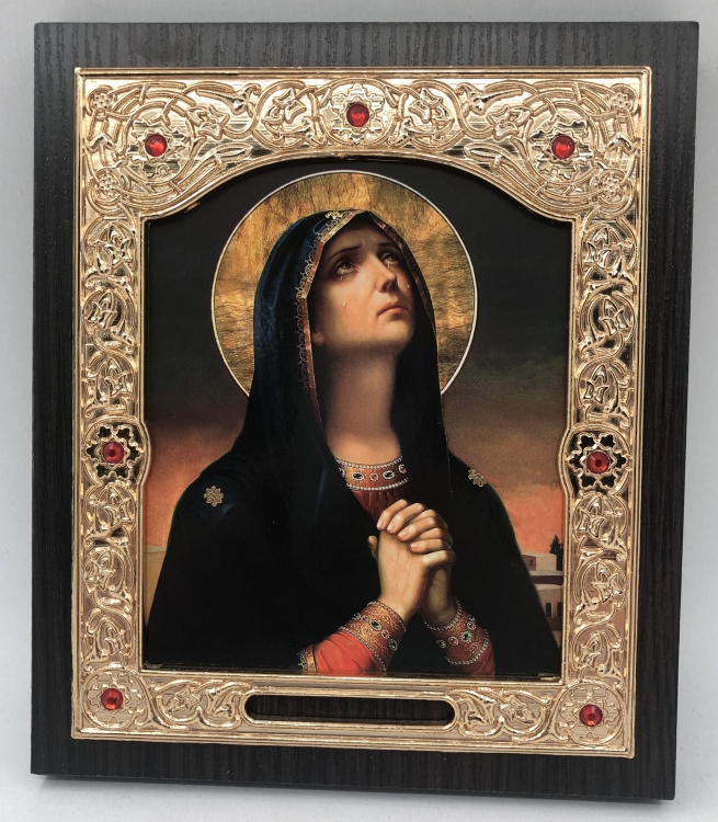 Икона Богородицы "Плачащая" рамка изготовлена ​​из деревянного основания. Оклад иконы выполнен из пластика с орнаментом, также оклад украшен красными камешками. Печать литографии на бумаге. Размер:15х18 см