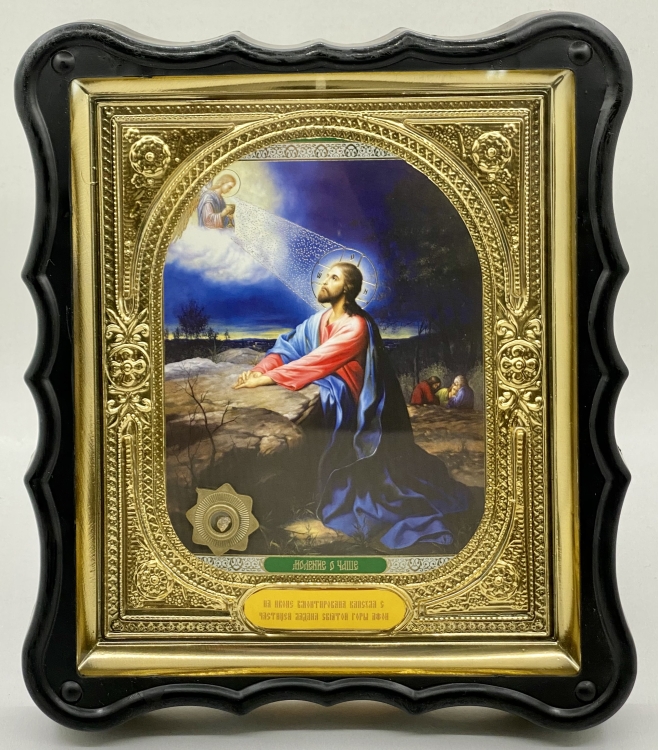 Рамка иконы имеет фигурную форму из черного пластика, подрамкник также выполнен из пластика, который имеет узор и поверхность покрыта золотистой краской, что придает эффектный контраст на фоне черной рамки. Литография выполнена на бумаге. Основным элементом этой иконы – это вмонтированная капсула с частицей ладана со святой горы Афон. Размер: 28см х 24см х 3,5см