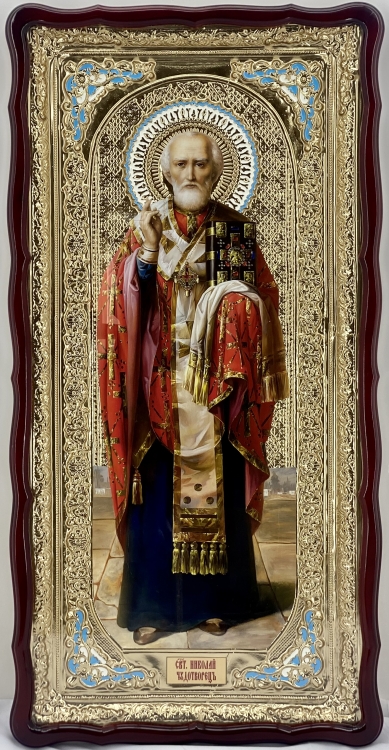 Ікона має дерев’яну рамку з покриттям лаку, що захищає поверхню. Підрамник виготовлений з пластику, та має красивий візерунок з напиленням золотистої фарби, також використовується на деякі елементи кольорова емаль. Літографія друкована на папері