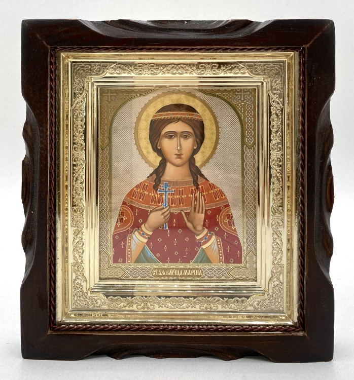 Икона имеет прямоугольную рамку, на которой выполняются узоры с помощью обжига. Подрамник сделан из пластика покрытого золотистой краской Литография выполнена на бумаге. Размер: 19х17