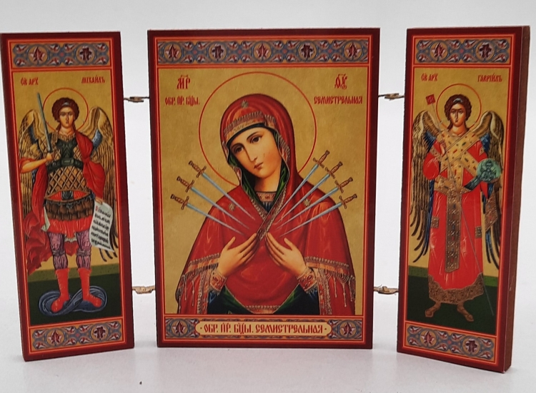 Ікона має дерев’яну основу, складається з тьох частин які з’єднується металевими петельками, за допомогою цього ікону можна регулювати. Літографія має друк на папері з золотистим тисненням