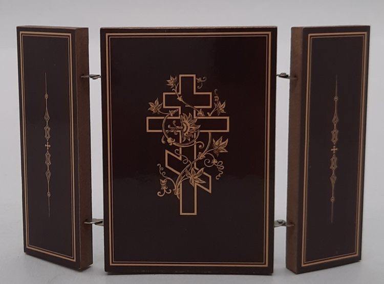 Ікона має дерев’яну основу, складається з тьох частин які з’єднується металевими петельками, за допомогою цього ікону можна регулювати. Літографія має друк на папері з золотистим тисненням