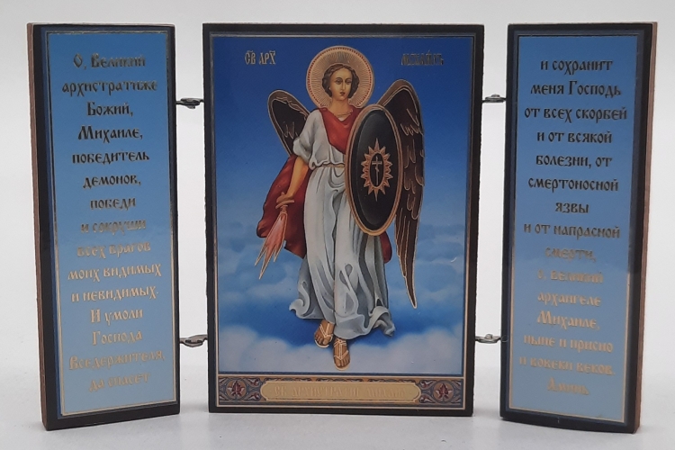 Ікона має дерев’яну основу, складається з тьох частин які з’єднується металевими петельками, за допомогою цього ікону можна регулювати. Літографія має друк на папері з золотистим тисненням