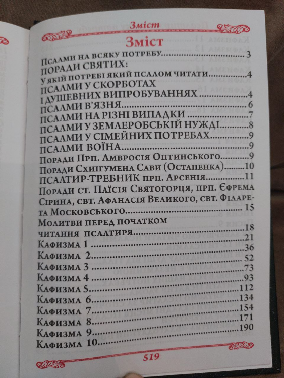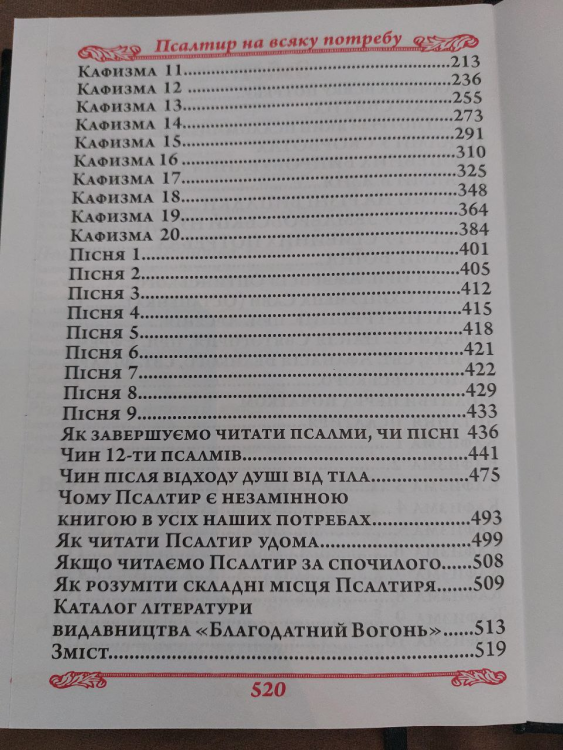 Містить усі псалми Давидові, поділені на 20 кафізм, а також: 9 пісень, чин 12 псалмів, чин після відходу душі від тіла.