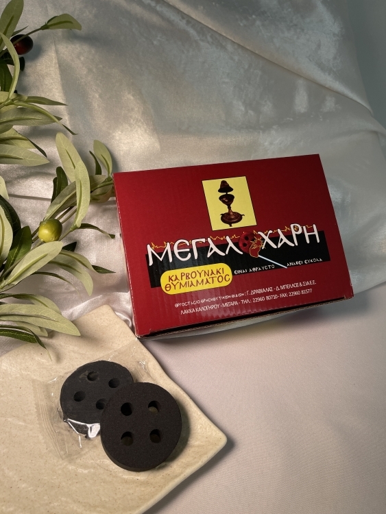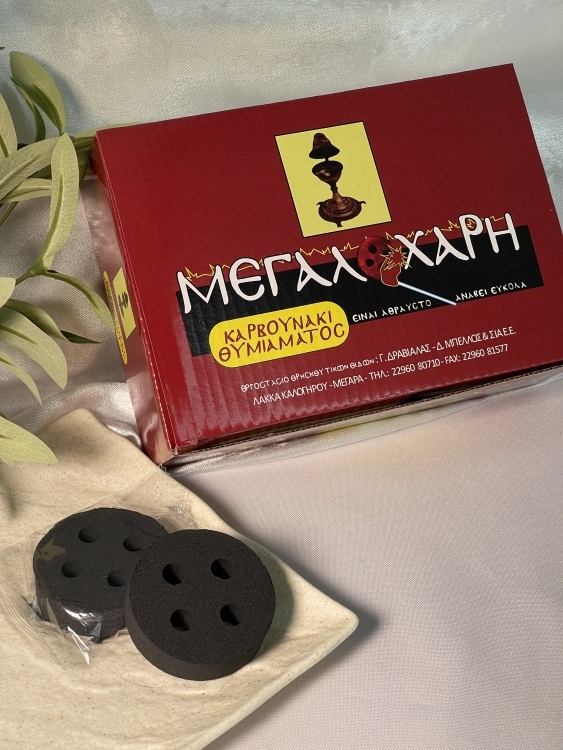 Вугілля кадильне Кількість у коробці:20 шт Країна виробник: Греція Форма: Таблекта з отворами Діаметр: 50мм Товщина: 15мм