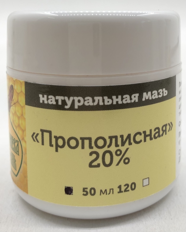 Показання: має бактерицидні, противірусні і протигрибкові властивості. Надає зцілюючий, знеболюючий, проти свербіжний та дезодоруючий ефект, стимулює регенерацію (відновлення) тканин. Склад: вазелін, прополіс. Застосування: наносити або накладати марлеву серветку з маззю до повного одужання. Термін придатності 2 роки.
