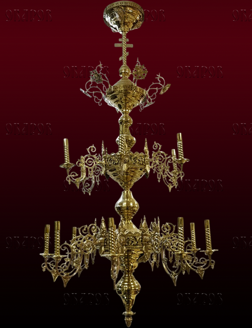 Панікадило, 2 яруси, 15 свічок Церковне двоярусне панікадило на 15 свічок виготовлене з високоякісного латунного сплаву. Його покриття виконане "під золото" та оздоблене декоративними елементами. Надійна конструкція забезпечує довговічність і стійкість до зовнішніх факторів. Це панікадило стане окрасою будь-якого храму. Для оформлення замовлення звертайтеся до менеджерів компанії або залишайте заявку на сайті.