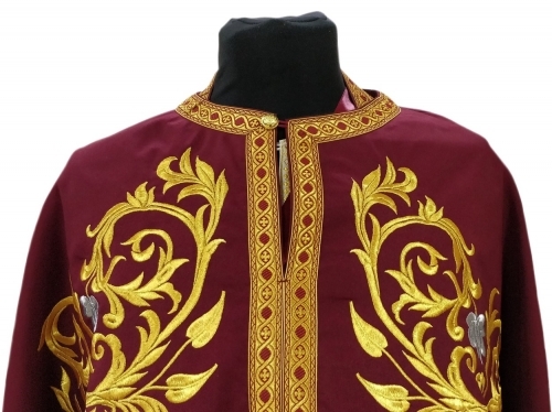 Облачение священника греческий крой, вышитое золотой и серебряной нитью на габардине, декорировано галуном и бахрамой. В комплект входит: фелон, епитрахиль, поручи, палица, набедренник, пояс и воздух с покровцами.