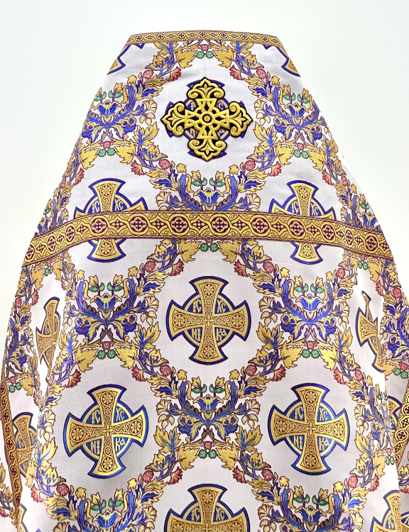 Облачення священника, пошито з якісної парчевої тканини, з подвійною металізацією, декоровано хрестами, галуном та бахрамою, підклад з креп-сатину. В комплект входить: фелон, єпітрахіль, поручі, набедренник, пояс та воздух з покровцями