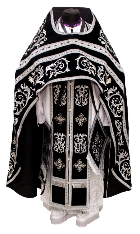 облачение священника, вышитое золотой и серебряной нитью на бархатном производстве Италия. В комплект входит: фелон, епитрахиль, поручи, палица, набедренник, пояс и воздух с покровцами.